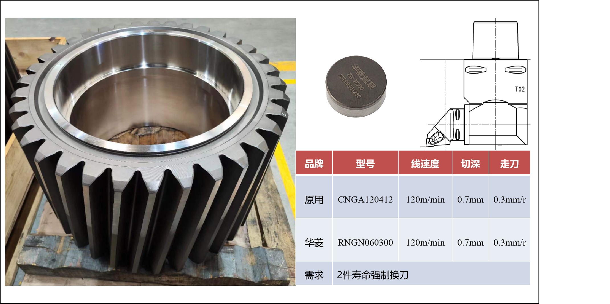 (1)風電齒輪外圈加工案例:加工的產品是風電減速機齒輪的內齒頂,直徑達到1300mm。工件尺寸很大,客戶原來使用的其他品牌的整體RNGN090400的CBN刀片,不僅導致崩刀問題,而且一件產品無法加工完成。華菱推薦使用BN-H200復合式RNGN090300的CBN刀片,并調整加工參數后,驚喜地發現,一個刃口可以至少加工兩件產品!